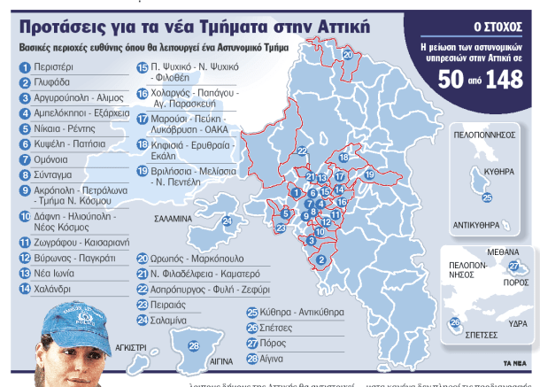 Σχέδιο «Καλλικράτης» θα εφαρμοστεί και στην Ελληνική Αστυνομία, ενώ θα ακολουθήσει και η Πυροσβεστική. Η αρχή θα γίνει τον Σεπτέμβριο, με τη συνένωση των αστυνομικών υπηρεσιών στην Αττική, και θα ακολουθήσουν η Θεσσαλονίκη και η επαρχία.Σύμφωνα με το σχέδιο του αρχηγείου της Ελληνικής Αστυνομίας, τα 148 αστυνομικά τμήματα, υπηρεσίες, και Υποδιευθύνσεις που υπάρχουν σήμερα θα μειωθούν σε 50, και οι 16 υπηρεσίες της Τροχαίας σε 5. Η ηγεσία της Ελληνικής Αστυνομίας εκτιμά πως με τη μείωση των αστυνομικών υπηρεσιών θα αποδεσμευτούν περισσότεροι από 1.000 αστυνομικοί που σήμερα απασχολούνται σε σκοπιές, φύλαξη κτιρίων και διοικητικές υπηρεσίες και με τον νέο σχεδιασμό θα βγουν στον δρόμο για περιπολίες. Επιπλέον θα εξοικονομηθεί ένα πολύ μεγάλο ποσό που σήμερα δαπανάται για την ενοικίαση των χώρων όπου στεγάζονται τα Αστυνομικά Τμήματα. Από τα 148 κτίρια που χρησιμοποιεί η Αστυνομία, μόλις τα 25 είναι ιδιόκτητα, με αποτέλεσμα να δαπανώνται αρκετά εκατομμύρια για την ενοικίασή τους.