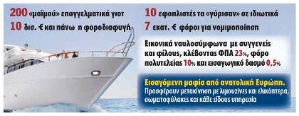 Σε 8.200 κροίσους με πολυτελή γιοτ έχει στραφεί το Σώμα Δίωξης Οικονομικού Εγκλήματος, βάζοντας στο στόχαστρο φοροδιαφυγή άνω των 10 δισ. ευρώ.Με την πολιτική εντολή «ξετρυπώστε τους όλους» ειδική ομάδα του ΣΔΟΕ, της οποίας ηγείται ο ειδικός γραμματέας Γιάννης Καπελέρης, βρίσκεται αντιμέτωπη με την πλέον μαφιόζικη εικόνα της σύγχρονης ελληνικής κοινωνίας; εισαγόμενους Ανατολικοευρωπαίους που ξεπλένουν μαύρο χρήμα νοικιάζοντας πολυτελή γιοτ για αποδράσεις ολίγων ημερών. Η τριπλέτα της φοροδιαφυγής έχει ως εξής: