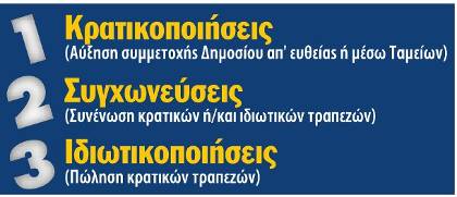 1Κρατικοποίηση – εθνικοποίηση τραπεζών. Πρόκειται, ουσιαστικά, για πολιτική διάσωσής τους εν μέσω της οικονομικής κρίσης. Το Ελληνικό Δημόσιο μπορεί να αυξήσει τη συμμετοχή του στις τράπεζες είτε μέσω του Ταμείου Χρηματοπιστωτικής Σταθερότητας, κάτι το οποίο άλλωστε το «επιτρέπει» και το Μνημόνιο, είτε με αύξηση του ποσοστού του μέσω αύξησης του μετοχικού κεφαλαίου, απ’ ευθείας ή μέσω ασφαλιστικών ταμείων.