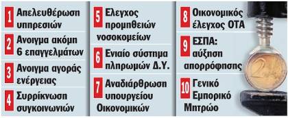 Με 10 εντολές προς την ελληνική κυβέρνηση, για το τι πρέπει να γίνει στο προσεχές δίμηνο, αναχωρεί η τρόικα των ελεγκτών από την Αθήνα.Οι επικεφαλής της Ευρωπαϊκής Επιτροπής Σερβάζ Ντερούζ, του ΔΝΤ Πολ Τόμσεν και της ΕΚΤ Κλάους Μαζούχ κλείστηκαν στο ξενοδοχείο όλο το Σαββατοκύριακο και ετοίμασαν το σχέδιο που θα αποτελέσει τη βάση του τελικού κειμένου, το οποίο θα συγγράψουν σήμερα ή αύριο με τον υπουργό Οικονομικών Γιώργο Παπακωνσταντίνου. Αναχωρώντας μεσοβδόμαδα από την πρωτεύουσα, η τρόικα μπορεί να φεύγει εν μέρει ικανοποιημένη, αλλά αφήνει πίσω της 10 εντολές, που πρέπει να έχουν γίνει πράξη μέχρι τον Οκτώβριο, οπότε και θα έρθουν για τον επόμενο έλεγχο, λίγο μετά την εγκατάσταση στην Αθήνα του μόνιμου εκπροσώπου του ΔΝΤ, Μπομπ Τράα.Ψάχνουν άλλα 9,6 δισ.Τον Οκτώβριο είναι που πρέπει να έχει κατατεθεί στη Βουλή και το προσχέδιο του προϋπολογισμού του 2011, στο οποίο θα καταγράφονται αναλυτικά τα μέτρα προσαρμογής 3,2% του ΑΕΠ ή 4,3% μαζί με τα οφέλη από τα μέτρα του 2010, ήτοι συνολικά 9,65 δισ. ευρώ και αφορούν φορολόγηση (αυθαίρετα, ημιυπαίθριοι, φόρος πολυτελείας, λογιστικός προσδιορισμός εισοδημάτων, τυχερά παιχνίδια, έκτακτη εισφορά επιχειρήσεων, μετάταξη συντελεστών ΦΠΑ, πράσινα τέλη, τεκμήρια, αύξηση αντικειμενικών αξιών, φορολογία αμοιβών σε είδος) ή μείωση δαπανών (ενδιάμεση κατανάλωση, ενιαίο σύστημα πληρωμών, πάγωμα συντάξεων, «Καλλικράτης», εισφορά υψηλών συντάξεων, μείωση δημοσίων επενδύσεων).