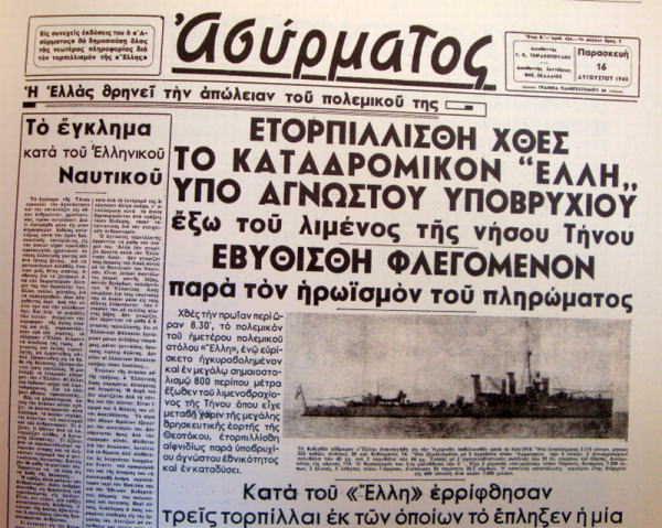 Η κυβέρνηση Μεταξά, ελέγχουσα πλήρως τον τύπο της εποχής με τη λογοκρισία που είχε επιβάλει, απέκρυψε το γεγονός της εθνικότητας του υποβρυχίου μέχρι και την 30ή Οκτωβρίου. Τότε, δύο μέρες μετά την κήρυξη του ελληνοϊταλικού πολέμου, με επίσημη ανακοίνωσή της διά του τύπου, γνωστοποίησε τους υπαίτιους του άνανδρου τορπιλισμού στον ελληνικό λαό.Όμως, από την πρώτη στιγμή ο Μεταξάς είχε δώσει εντολή στην ηγεσία του τότε ΓΕΝ να διενεργήσει άμεσα και με πλήρη μυστικότητα έρευνες, προκειμένου να διαπιστωθεί η εθνικότητα του άγνωστου υποβρυχίου.