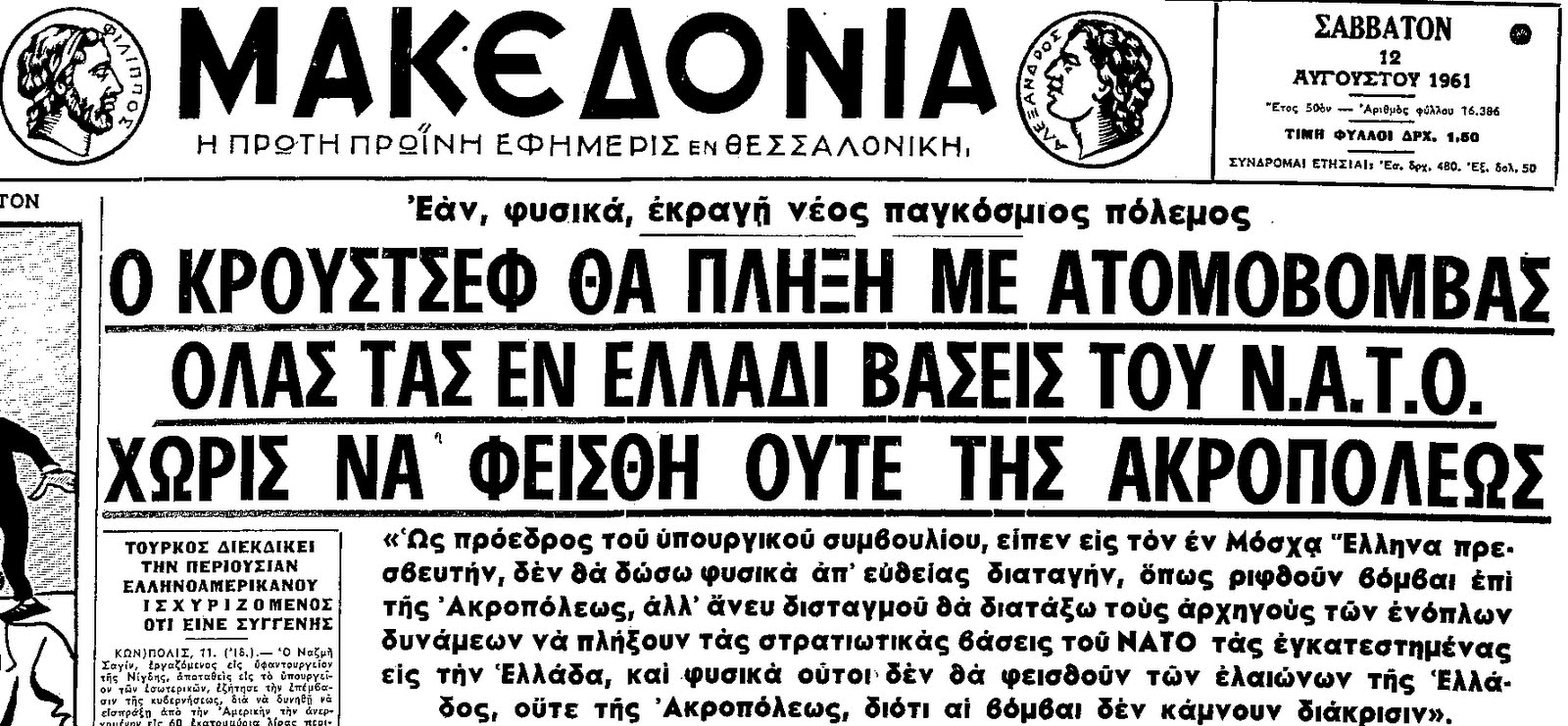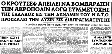 η Ακρόπολις. Δεν θα διστάσω όμως να διατάξω τας αρμοδίους στρατιωτικάς αρχάς να συντρίψουν τας στρατιωτικάς βάσεις του ΝΑΤΟ στην Ελλάδα. Και βεβαίως οι Σοβιετικοί στρατιωτικοί δεν θα φεισθούν τους ελαιώνας σας, ούτε την Ακρόπολιν, διότι αι βόμβαι ουδεμίαν κάνουν διάκρισιν».