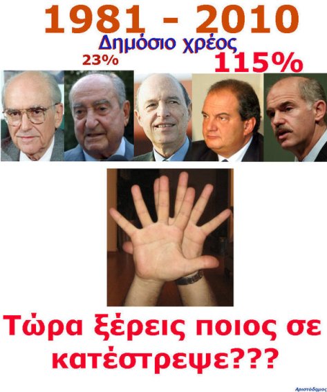 Επισης….ειναι γνωστο οτι ολες οι κυβερνησης εχουν τεραστια ευθυνη,για το οτι η Ελλαδα εφτασε ενα βημα πριν τη χρεοκοπια!!!!!!αλλα θα πρεπει να ξερουμε οτι το 2004 το δημοσιο χρεος της Ελλαδος ηταν 180 δις ευρω…….και οταν δραπετευσε ο χοντροποντικας Καραμανλης το παρεδωσε 300!!!!!!120 δις ευρω μεσα σε 5.5 χρονια…….αυτο δεν το λεω για να αθωωσω τους αλλους,αλλα ετσι για ενα μετρο συγκρυσεις!
