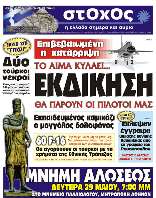 και για τον εγκλοβισμό και την καθήλωση στο έδαφος ολόκληρης της τουρκικής αεροπορίας με αποτέλεσμα τα ελληνικά μιραζ και F-16 να εκτελούν χαμηλές πτήσεις πάνω από την Σμύρνη και την Κωνσταντινούπολη, επανερχόμαστε στο επόμενο φύλλο του “Στόχου”. Εκεί θα αναλύσουμε και το γιατί τα πουλημενα ΜΜΕ κατ΄ εντολήν του καθεστώτος κράτησαν κρυφή αυτήν την ιστορία.“ΣΤΟΧΟΣ”>> και παρακάτω λέει—-