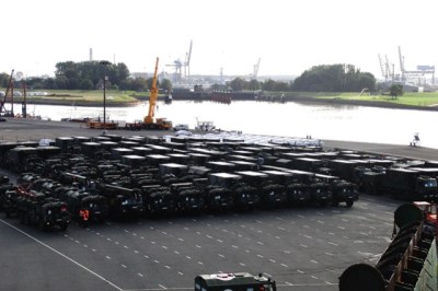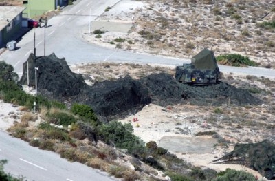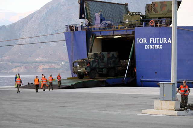 | Μεγάλο μέρος του αντιεροπορικού υλικού έφθασε στη Κρήτη ήδη από τον Σεπτέμβριο. Η φωτογραφία από την εκφόρτωση μέρους του συστήματος Patriot στην Κρήτη, από το πλοίο «Tor Futura». |