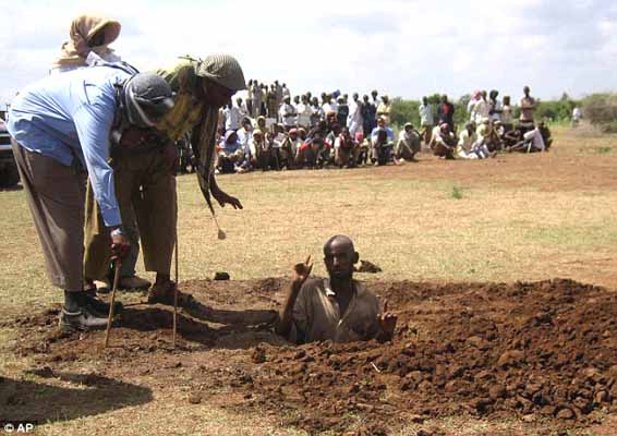 Στη συνέχεια κατεβάζουν σπρώχνοντας στο σημείο και τον άνδρα «εγκληματία». Αρχικά του δένουν τα μάτια και στη συνέχεια τον ξαπλώνουν στο έδαφος και αρχίζει ο ανελέητος λιθοβολισμός…
