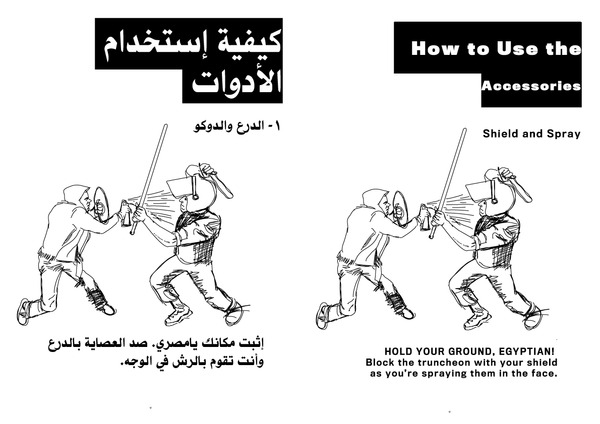 Επίσης σε BLOG και ξένο τύπο διαβάζουμε για ανώνυμα Εικονογραφημένα φυλλάδια διαμαρτυρίας που διανέμονται στο Κάιρο τα οποία παρέχουν πρακτικές συμβουλές και τακτικές για την αντιμετώπιση των ΜΑΤ, και την πολιορκία των κυβερνητικών γραφείων .