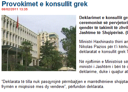 Ο υπουργός Εξωτερικών, Χατζηνάστο κάλεσε τον Έλληνα Πρέσβη στα Τίρανα, Νικόλαο Πάζιο, να δώσει διευκρινήσεις για τις δηλώσεις του Έλληνα πρόξενου Θεόδωρου Οικονόμου.