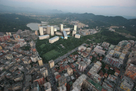 «…From the Architects: «The cantilevered and leaning buildings allow for a great variety of apartment types, shopping and offices and ‘echo’ the Tirana typology. The stacked and twisted volumes create spectacular public spaces and provide dramatic vistas. Clad in local stones the buildings turn into a series of ‘rocks’, the ‘Tirana Rocks’….»