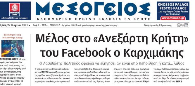 Η αλήθεια, όμως, είναι διαφορετική. Εδώ και πολλά χρόνια οι ελληνικές μυστικές υπηρεσίες ερευνούν και παρακολουθούν στενά οποιαδήποτε δραστηριότητα συσχετίζεται με το ζήτημα της «Κρητικής Πολιτείας», εντός και εκτός Ελλάδος. Και οι πληροφορίες λένε ότι δυστυχώς υπάρχει τέτοια κινητικότητα. Μια περιδιάβαση στο διαδίκτυο επιβεβαιώνει πλήρως τις ανησυχίες μας. Χαρακτηριστικό παράδειγμα αρκετές σελίδες του “Facebook”. Μία μάλιστα σελίδα με τον τίτλο «Ανεξάρτητη Κρήτη» αριθμεί 2135 μέλη, ενώ μια άλλη με τίτλο «Η Κρήτη θέλει να γίνει ανεξάρτητη….!!!! Αέρα Κρήτη αέρα…» αριθμεί 1654 μέλη, στο λογότυπό της μάλιστα υπάρχει και η σχετική μαντινάδα: «Θέλω να ζω ανεξάρτητος μόνο με νόμους Κρήτης, να μη λογίζομαι Έλληνας μα Κρητικός πολίτης»!!! Υπάρχουν ακόμα άλλες είκοσι ομάδες που αριθμούν τουλάχιστον τριακόσια μέλη η καθεμιά!!!