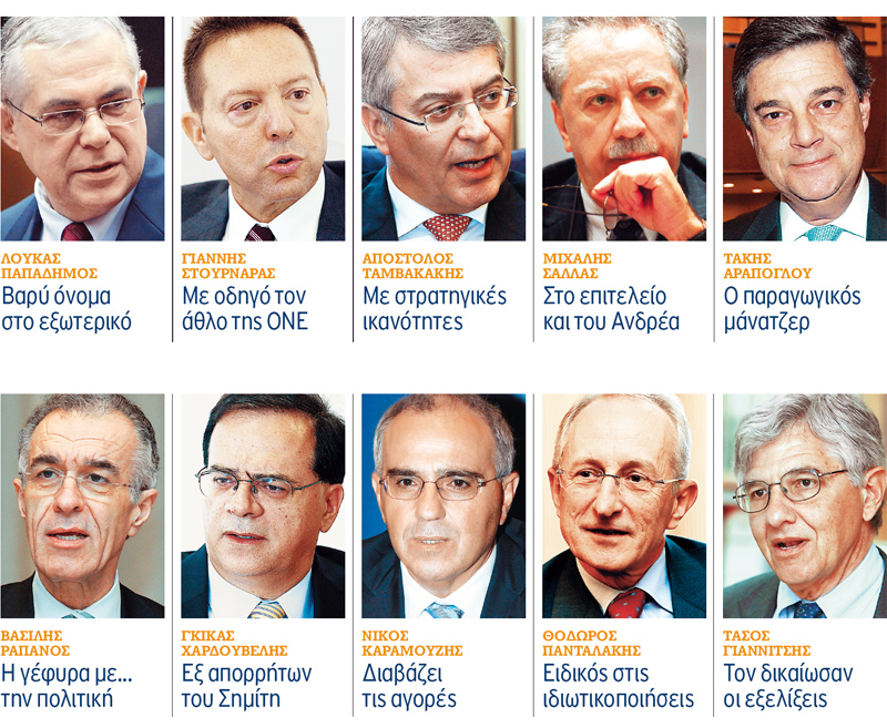 Στελέχη με υψηλή εξειδίκευση, πιστοποιητικά αποτελεσματικότητας και ισχυρές γνωριμίες στα πολιτικά και κυρίως τα τεχνοκρατικά δρώμενα της Ευρώπης και της Αμερικής, καλούνται να υλοποιήσουν το δύσκολο έργο της μη πτώχευσης και της ανασυγκρότησης της οικονομίας.Εχουν θητεύσει στο παρελθόν σε καίριες θέσεις μεγάλων επιχειρήσεων αλλά και του κρατικού μηχανισμού, εγγράφοντας επιτυχίες ο καθένας στον τομέα του, ενώ στα αξιοσημείωτα είναι ότι η πλειονότητα προέρχεται από τον τραπεζικό κλάδο. Πρόκειται για τους τεχνοκράτες που ακούγεται πως έχουν βολιδοσκοπηθεί από το Μαξίμου τις προηγούμενες ημέρες, προκειμένου να συμμετάσχουν σε μια κυβέρνηση «σωτηρίας», η οποία θα αναλάβει να προχωρήσει εκείνους τους κρίσιμους τομείς της κρατικής μηχανής που καθυστερούν απελπιστικά.