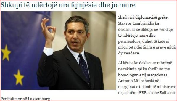 Ο νέος επικεφαλής της ελληνικής διπλωματίας Σταύρος Λαμπρινίδης, είπε ότι τα Σκόπια αντί να βρίσκονται σε κατάσταση να χτίζουν τείχη και μνημεία, θα πρέπει να δώσουν προτεραιότητα στην οικοδόμηση γεφυρών μεταξύ των δύο χωρών.