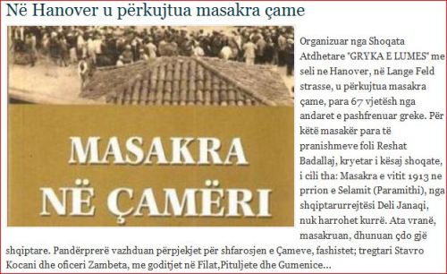 Ο πατριωτικός Σύνδεσμος «GRYKA E LUMES» που έχει έδρα στη Feld Lange Strasse, του Ανόβερο της Γερμανίας, πραγματοποίησε εκδήλωση για τη ‘σφαγή των Τσάμηδων’ από τους Έλληνες. «Για τη σφαγή αυτή μίλησε ο Reshat Badallaj, πρόεδρος του Συλλόγου ο οποίος τόνισε ότι δεν μπορεί να ξεχαστεί η σφαγή του 1913 στη Σαλάμ / Παραμυθιά με τον μισαλβανό Γιανάκη Ντελή. Δολοφόνησαν, έσφαξαν, βίασαν, έκαναν τα πάντα στους Αλβανούς. Η εξόντωση των Τσάμηδων ήταν συνεχής και αδιάλειπτος από τους φασίστες Σταύρο Κότσανι και Ζαμπέτα Κότσανι με επιθέσεις στην περιοχή της Ηγουμενίτσας. Μάλιστα, ο πρόεδρος του αλβανικού συλλόγου του Ανόβερου δεν παρέλειψε να πει ότι « αργά ή γρήγορα, πρέπει να επιστραφεί στην Αλβανία από το Ελληνικό Δημόσιο, αυτή η έκταση των 6.000 τετραγωνικών χιλιομέτρων που αφαιρέθηκε άδικα από την Αλβανία στην Διάσκεψη του Λονδίνου». Δεν παρέλειψε, ακόμη, να καταφερθεί και κατά των εκπροσώπων της ελληνικής μειονότητας της Αλβανίας, το Βασίλη Μπολάνου, το Βαγγέλη Ντούλε καθώς και τον αρχιεπίσκοπο Αλβανίας Αναστάσιο, για τους οποίους ανέφερε ότι πρέπει «να θεωρηθούν ‘ Persona non grata’ να απελαθούν στην Ελλάδα και να μην επιστρέψουν ποτέ». Καταδίκασε μάλιστα όλους όσους παραβιάζουν τους τάφους των προγόνων τους και προέβαλε οικογένειες αλβανοτσάμηδων που είχαν καταφερθεί κατά των Ελλήνων στην περιοχή της Θεσπρωτίας. πηγη