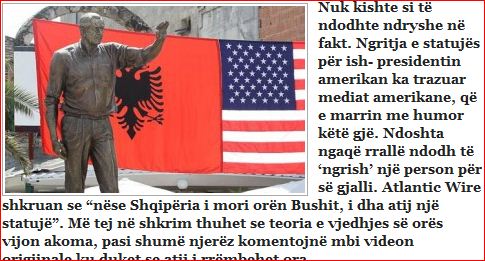 Αμερικανικά ΜΜΕ κοροϊδεύουν τους Αλβανούς… Posted on 9 Ιουλίου, 2011 by Δ.-Ι. 3 Σχόλια «Δεν μπορεί να είναι αλήθεια», γράφουν τα αμερικανικά μέσα ενημέρωσης με την ανέγερση του αγάλματος του πρώην προέδρου των ΗΠΑ στην Αλβανία. Οι αμερικανοί το παίρνουν ως χιούμορ. Ίσως επειδή είναι σπάνιο να ‘παγώσει’ ένα πρόσωπο το οποίο βρίσκεται ακόμη εν ζωή. Η εφημερίδα ‘Atlantic Wire’ γράφει ότι «η Αλβανία πήρε τον υπόλοιπο χρόνο της ζωής του Μπους και του έδωσε ένα άγαλμα». Όλοι αναφέρουν ότι επιλέχθηκε η μέρα αποκάλυψης του αγάλματος, η 6η Ιουλίου, ημέρα των γενεθλίων του Μπους, που μπήκε αισίως στα 65 του χρόνια. πηγη Κοινοποιήστε:Tweet Κλικ για αποστολή ενός συνδέσμου μέσω email σε έναν/μία φίλο/η(Ανοίγει σε νέο παράθυρο) Email Κλικ για εκτύπωση(Ανοίγει σε νέο παράθυρο) Εκτύπωση Μου αρέσει! Φόρτωση... Σχετικά