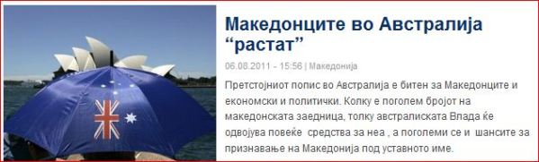 Όσος μεγαλύτερος είναι ο αριθμός των Σλάβων, τόσο αυξημένοι θα είναι και οι πόροι της αυστραλιανής κυβέρνησης προς αυτούς και αυτό θα σημάνει και αύξηση των πιθανοτήτων για αναγνώρισης της FYROM με το όνομα « Μακεδονία», αναφέρει σήμερα η Σνεζάνα Γιοβανόσφσκα, δημοσιογράφος της τηλεόρασης ‘Σίτελ’ των Σκοπίων, αφού οι Σλάβοι εδώ και μια δεκαπενταετία (περίπου) απαρνήθηκαν την σλαβική καταγωγή και ονομασία τους και αυτοπροσδιορίζονται ως ‘Μακεδόνες’, απόγονοι του Φιλίππου Β’ και του Μέγα Αλέξανδρου…