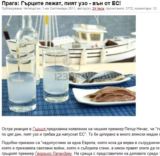 «Οξεία αντίδραση προκλήθηκε στην Ελλάδα από τη δήλωση του Τσέχου πρωθυπουργού, Peter Nechas, ότι «οι Έλληνες δεν εργάζονται, κάθονται όλη μέρα πίνοντας ούζο και πρέπει να εγκαταλείψουν την ΕΕ», αυτό αναφέρθηκε σε πολλά μέσα ενημέρωσης της Αθήνας χθες, γράφει η βουλγαρική εφημερίδα «24 ώρες».