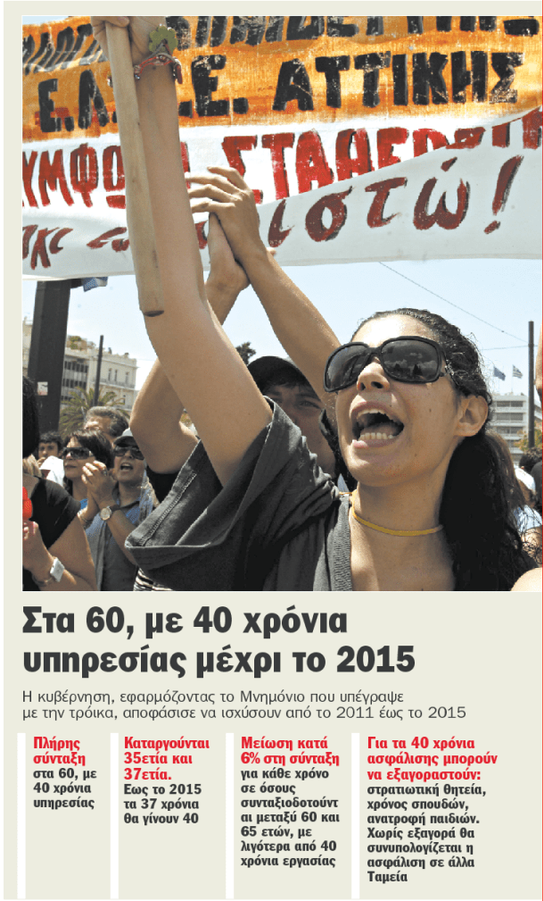 Ιδού µια στιχοµυθία που θα µπορούσε να είναι αληθινή: «Τι; Είσαι συνταξιούχος; Φτου σου παλικάρι µου, ούτε 40 χρονώ δε µοιάζεις», «Μα δεν τα έχω κλείσει τα 40». Ο συνταξιούχος θα µπορούσε να είναι πιλότος ελικοπτέρων στον στρατό, αξιόµαχος, υγιής, µε σώας τας φρένας. Σε κάποιες ειδικότητες τα χρόνια µετρούσαν διπλά, προσέθεταν ως συντάξιµα τα χρόνια της εκπαίδευσης και αποσύρονταν από την εργασία προτού εµφανιστεί η πρώτη ρυτίδα. ∆εν πήγαιναν όµως στον καφενέ αφού στον ιδιωτικό τοµέα ήταν περιζήτητοι. Ας µη µιλήσουµε για τις γυναίκες και τις ταπεινωτικές για το φύλο «πρόωρες συντάξεις». Επί µακρόν θεωρήθηκε λογικό να δουλεύουν επί 15 χρόνια και να παίρνουν σύνταξη επί 30 χρόνια, µε δικαιολογητικό το ανήλικο. Και εδώ υπήρχε το παράδοξο: η µάνα έφευγε από τη δουλειά όταν το παιδί αποκτούσε την ανεξαρτησία της προχωρη µένης εφηβείας. ∆ιακρίνεται εν τούτοις άλλη κατηγορία συνταξιούχων: οι ανύπανδρες κόρες δηµοσίων υπαλλήλων. Πριν από λίγα χρόνια είχε υπολογιστεί ότι περί τις 80.000 γυναίκες εισέπρατταν κρατικό βοήθηµα µε αυτή την ιδιότητα. Επαιρναν «σύνταξη άγαµης θυγατέρας» κυρίες µε εµπορικές επιχειρήσεις στο όνοµά τους, µε µόνιµη δουλειά ή µε υψηλά εισοδήµατα από ενοίκια.