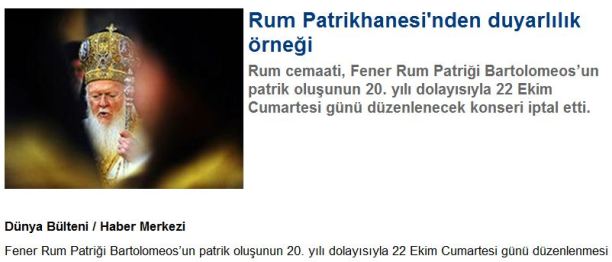 «Παράδειγμα ευαισθησίας», γράφει το τουρκικό ‘Dünya Bülteni’, «αποτελεί η απόφαση του Ορθόδοξου Ελληνικού Πατριαρχείου, της ελληνικής κοινότητας, του Πατριάρχη Βαρθολομαίου να ματαιώσει 20η επετειακή συναυλία που θα πραγματοποιούνταν στις 22 Οκτωβρίου λόγω της αποτρόπαιης επίθεσης που πραγματοποιήθηκε (από τους Κούρδους κατά των Τούρκων) στην περιοχή Χακάρι.