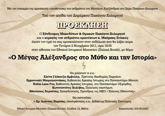 Προ των αποκαλυπτηρίων του ανδριάντα, και ειδικώς την Τετάρτη 2 Νοεμβρίου 2011 (εσπέρας), οργανώνουμε εκδήλωση στην αίθουσα της Παλιάς Βουλής, με θέμα «Ο Μέγας Αλέξανδρος στο Μύθο και την Ιστορία», με σκοπό να παρουσιαστεί το έργο και η προσωπικότητά του μεγάλου στρατηλάτη.