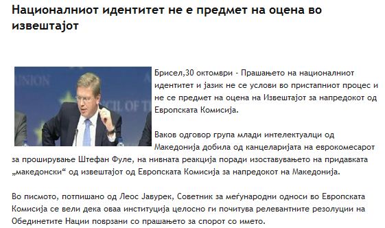 Αυτή ήταν η απάντηση που έλαβε ομάδα νέων διανοουμένων των Σκοπίων από το γραφείο του Ευρωπαίου Επιτρόπου, αρμόδιου για την Διεύρυνση της ΕΕ, Στέφαν Φούλε, για τις αντιδράσεις τους, λόγω της παράλειψης του επιθέτου «μακεδονικός/ή» από την έκθεση προόδου της Επιτροπής για την πΓΔΜ.