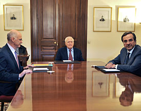 Η συγκρότηση νέας κυβέρνησης, «με στόχο να οδηγήσει τη χώρα άμεσα σε εκλογές μετά την υλοποίηση των αποφάσεων του Ευρωπαϊκού Συμβουλίου της 26ης Οκτωβρίου» αποφασίστηκε κατά τη συνάντηση του Προέδρου της Δημοκρατίας, του πρωθυπουργού Γιώργου Παπανδρέου και του προέδρου της ΝΔ Αντώνη Σαμαρά νωρίτερα απόψε (Κυριακή), σύμφωνα με ανακοίνωση που εξέδωσε η Προεδρία της Δημοκρατίας.