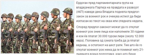 Το νομοσχέδιο προβλέπει την εξαγορά της στρατιωτικής θητείας σε άτομα που έχουν συμπληρώσει τα 30 χρόνια τους και θα πληρώσουν για αυτήν 30.000 τουρκικές λίρες (περίπου 12.000 ευρώ). Το μισό του ποσού υποχρεούται ο ενδιαφερόμενος να το καταβάλει άμεσα και τα υπόλοιπα σε έξι άτοκες μηνιαίες δόσεις.