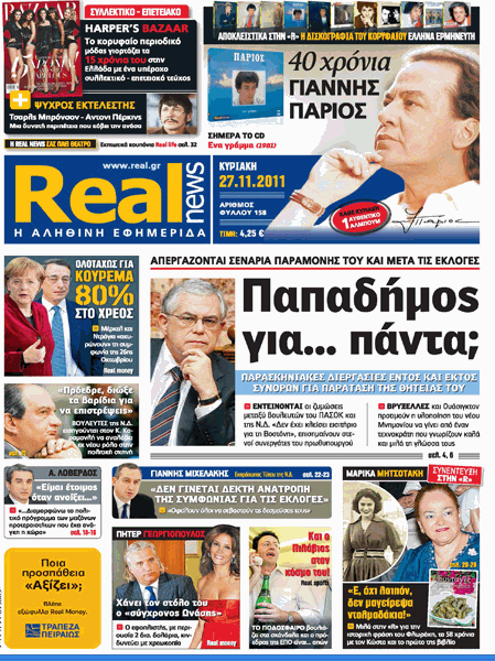 Με τίτλο: «Παπαδήμος για…πάντα;» κυκλοφορεί αυτήν την Κυριακή η Realnews, η οποία αναφέρεται στις παρασκηνιακές διεργασίες εντός και εκτός συνόρων για την παράταση της θητείας του νυν Πρωθυπουργού. Σύμφωνα με το ρεπορτάζ της εφημερίδας «εντείνονται οι ζυμώσεις μεταξύ βουλευτών του ΠΑΣΟΚ και της ΝΔ, την ώρα που στενοί συνεργάτες του Πρωθυπουργού επισημαίνουν: δεν έχει κλείσει εισιτήριο για τη Βοστόνη». Η Realnews αποκαλύπτει ότι «Βρυξέλλες και Ουάσιγκτον προτιμούν η υλοποίηση του ………… νέου Μνημονίου να γίνει από έναν τεχνοκράτη που γνωρίζουν καλά και μιλά τη γλώσσα τους». ..