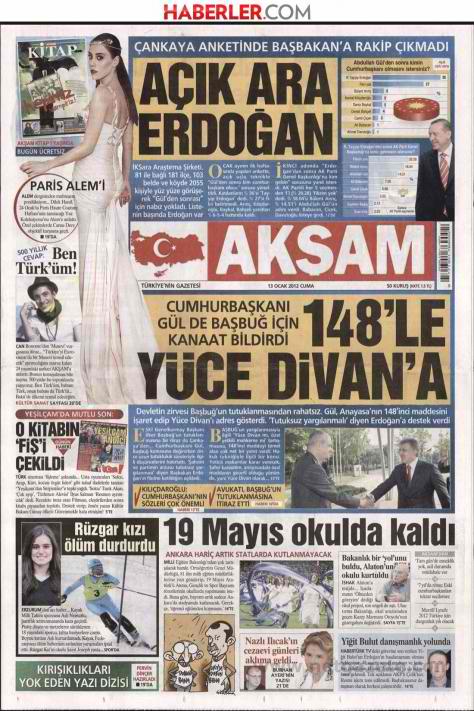 «Με μεγάλη διαφορά ο Ερντογάν» είναι ο τίτλος της εφημερίδας Akşam που αναφέρεται σε δημοσκόπηση σχετικά με την προεδρία της δημοκρατίας.