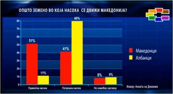 Σε σχετική δημοσκόπηση καταγράφηκε ότι το 52 τοις εκατό των πολιτών σλαβικής καταγωγής θεωρεί ότι η χώρα κινείται προς την σωστή κατεύθυνση, αλλά το 81(!) της εκατό των πολιτών, αλβανικής καταγωγής, θεωρεί ότι κινείται προς λάθος κατεύθυνση…