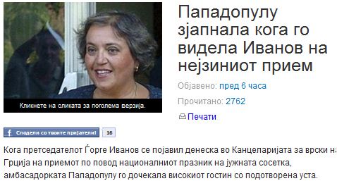 Όταν ο πρόεδρος των Σκοπίων, Γκιόργκι Ίβανοφ, εμφανίστηκε στο Γραφείο Συνδέσμου της Ελλάδας, για την επέτειο της ελληνικής εθνικής εορτής της 25ης Μαρτίου, η επικεφαλής της ελληνικής αντιπροσωπείας Αλεξάνδρα Παπαδοπούλου, έμεινε με το στόμα ανοιχτό από την απρόσμενη επίσκεψη του υψηλού επισκέπτη της, γράφει το σκοπιανό δημοσίευμα.