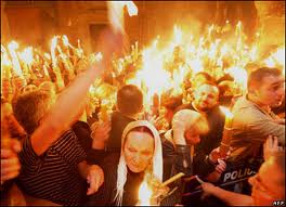 Οι καμπάνες χτυπούν χαρμόσυνα και οι προσκυνητές από όλο τον κόσμο απλώνουν τα χέρια τους, στα οποία κρατούν τις δεσμίδες με τα 33 κεριά -όσα και τα χρόνια του Χριστού- για να πάρουν την ιερή φλόγα.