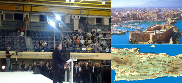Σε άδεια καθίσματα μίλησε ο αρχηγός του ΠΑΣΟΚ Ευάγγελος Βενιζέλος στο Ηράκλειο της Κρήτης, σε ένα από τα παραδοσιακά κάστρα του κόμματος.