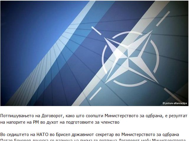 Αποτέλεσμα των προσπαθειών της Δημοκρατίας στο πνεύμα της προετοιμασίας για την ένταξη, υπεγράφη συμφωνία, για επέκταση της συνεργασίας, στο αρχηγείο του ΝΑΤΟ στις Βρυξέλλες μεταξύ του Υπουργείου Άμυνας των Σκοπίων και του Οργανισμού.
