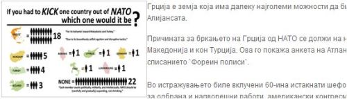 Σύμφωνα με τις απαντήσεις των ερωτηθέντων για την απέλαση της Ελλάδας από το ΝΑΤΟ, είναι η ελληνική στάση απέναντι στην FYROM και στην Τουρκία που εμπνέεται από απεριόριστο εγωϊσμό και λάθος συμπεριφορά.