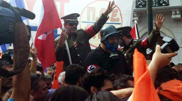 Γρήγορα και στις δύο συγκεντρώσεις τα πανό έγιναν δεκάδες, ενώ γύρω στις 14.00 εμφανίστηκε στην πλατεία και ένα ανοιχτό στρατιωτικό τζίπ με τους επιβάτες όρθιους ντυμένους με στολές των Ναζί, οι οποίοι περιστοιχίζονταν γερμανικές σημαίες της εποχής του Β’Π.Π.