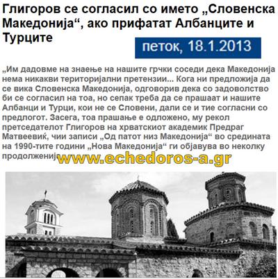 Στο δημοσίευμα τονίζεται ότι ο Κίρο Γκλιγκόροφ είχε δηλώσει ότι τα Σκόπια δεν έχουν εδαφικές διεκδικήσεις και για το «Σλαβική Μακεδονία» θα συμφωνούσε αλλά «επιθυμούσε να το συζητήσει με τους Αλβανούς και τους Τούρκους της χώρας οι οποίοι δεν είναι Σλάβοι, εάν συμφωνούν με την πρόταση αυτή».
