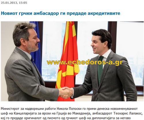 Ο υπουργός Εξωτερικών Νίκολα Πόποσκι, δέχθηκε σήμερα το διορισθέντα επικεφαλής του Γραφείου Συνδέσμου της Ελλάδας στα Σκόπια, πρέσβη Θεοχάρη Λαλάκο, ο οποίος έδωσε το πρωτότυπο της επιστολής του Έλληνα υπουργού Εξωτερικών, για το διορισμό του σε αυτό το λειτούργημα.