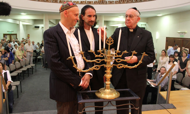Στην παραπάνω φωτογραφία διακρίνεται ο νέος Πάπας Φραγκίσκος (Χορχε Μάριο Μπεργκόλιο) στην συναγωγή του Buenos Aires να ανάβει την επτάφωτη λυχνία (menorah).
