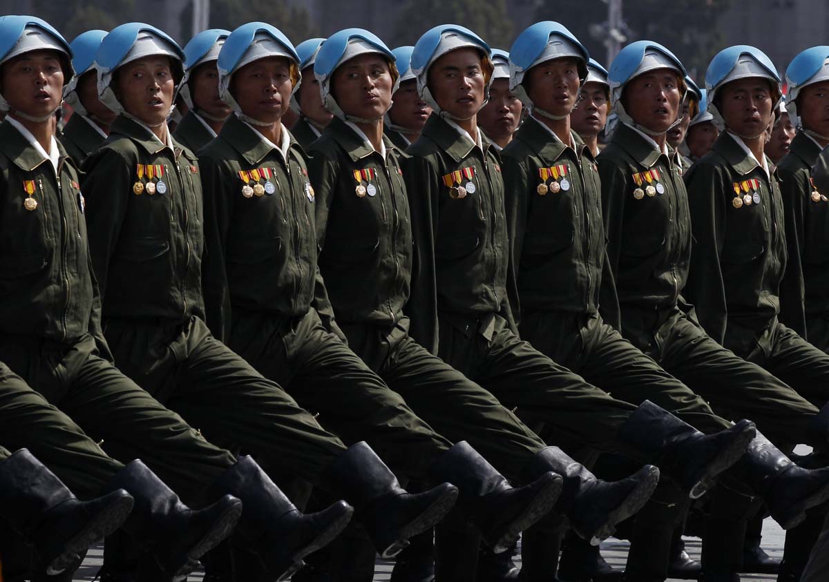 Military pilots shout as they march past the podium during a military parade to celebrate the centenary of the birth of North Korea founder Kim Il-sung in Pyongyang April 15, 2012. REUTERS/Bobby Yip (NORTH KOREA – Tags: POLITICS MILITARY ANNIVERSARY) ORG XMIT: PYG29