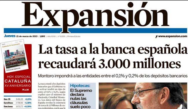 To μέτρο της φοροληστείας των τραπεζικών καταθέσεων επεκτείνεται σε όλη την Ευρώπη όπως φαίνεται. Σύμφωνα με δημοσίευμα της ισπανικής εφημερίδας Expansion, ο Ισπανός υπουργός οικονομίας Κ. Μοντόρο δήλωσε χθες ότι θα επιβληθεί ένας χαμηλός φόρος στις καταθέσεις των ισπανικών τραπεζών.