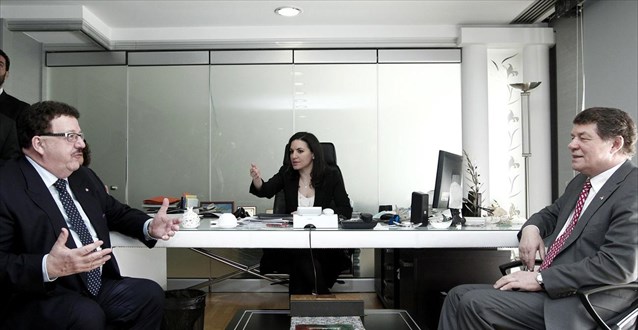 Η υπουργός Τουρισμού Όλγα Κεφαλογιάννη (κέντρο) υποδέχεται τον υφυπουργό Εργασίας της Γερμανίας Χανς Φούχτελ (αριστερά) και τον πρώην προπονητή της Εθνικής Ελλάδος Ότο Ρεχάγκελ (δεξιά) στο υπουργείο Τουρισμού.