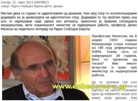 πρώην υπουργός Εξωτερικών, καθηγητής Ντένκο Μαλέσκι-Денко Малески, σε συνέντευξή του στο Ράδιο Σλόμπονταν Εβρόπα, γράφει το σκοπιανό δημοσίευμα.