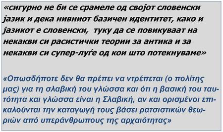 Άλλωστε, από την πλευρά μας δεν θα πρέπει να ντρέπεται κανείς για τη σλαβική του γλώσσα και ότι η σλαβική είναι η βασική ταυτότητά του,