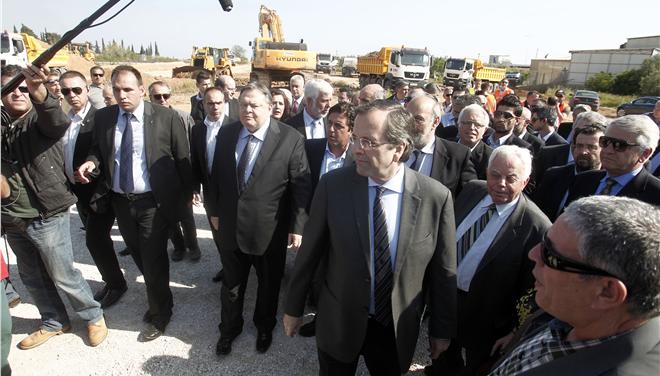 Ο Πρωθυπουργός Αντώνης Σαμαράς και ο αρχηγός του ΠΑΣΟΚ Βαγγέλης Βενιζέλος επιθεώρησαν από κοινού το πρωί της Πέμπτης τα εργοτάξια των έργων, που ξεκίνησαν και πάλι, στην Ολυμπία Οδό. Στην επίσκεψη στο εργοτάξιο των αυτοκινητοδρόμων, τη ΔΗΜΑΡ εκπροσώπησε ο βουλευτής της ΔΗΜΑΡ Νίκος Τσούκαλης, καθώς ο Φώτης Κουβέλης απουσιάζει στις Βρυξέλλες.