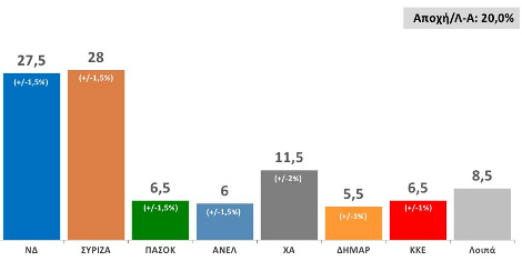 Συγκεκριμένα, στην ερώτηση για την εκτίμηση της πολιτικής επιρροής των κομμάτων, το 28% των 1.031 ερωτηθέντων που συμμετείχαν στην έρευνα, δηλώνει ότι θα ψήφιζε ΣΥΡΙΖΑ σε ενδεχόμενο εκλογών, ενώ το 27,5% θα ψήφιζε ΝΔ.