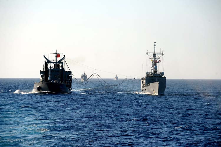 DENİZKURDU-13’ün üçüncü safhası faaliyetleri için Orta Ege’de bulunan gemiler, çeşitli senaryolarla olası saldırılara karşı hazırlanıyor. Denizkurdu-13 tatbikatına dahil olan gemilerden akaryakıt gemisi Yarbay Kudret Güngör’e yaklaşarak denizde akaryakıt ikmali yaptı. (Anadolu Ajansı – Erçin Top)