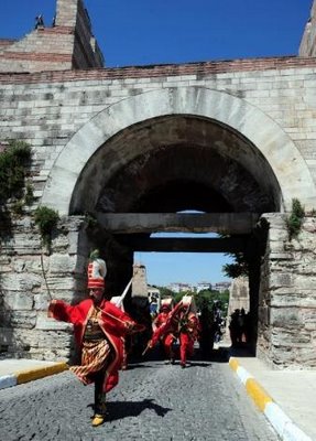 * Στην φωτογραφία γενίτσαροι περνάνε απο την Πύλη του Βελιγραδίου (μια απο τις δεκάδες πύλες της Πόλης) κατα την διάρκεια της «αναπαράστασης».