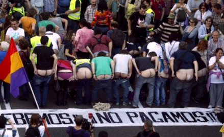 Οι διαδηλωτές, στην προσπάθειά τους να δείξουν τη δυσαρέσκειά τους στα μέτρα που έχει επιβάλλει η τρόικα, κατέβασαν τα παντελόνια τους και έδειξαν τα οπίσθια τους.
