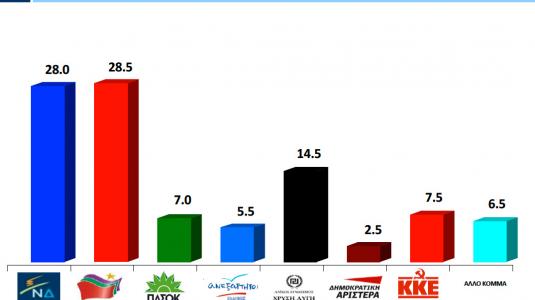 Συγκεκριμένα, στην εκτίμηση της εκλογικής επιρροής, ο ΣΥΡΙΖΑ προηγείται με 28,5%, ενώ η ΝΔ συγκεντρώνει 28%.