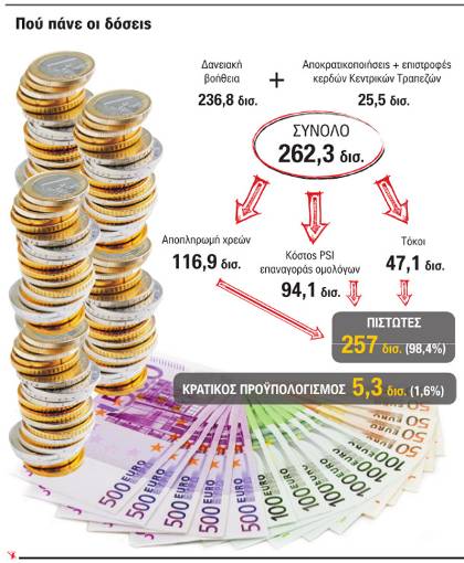 Γιατί από το σύνολο των έτσι διαθέσιμων κεφαλαίων ύψους 262,3 δισ. θα πρέπει να καλυφθεί πρωτίστως η αποπληρωμή χρεών (116,9 δισ.), το κόστος του PSI και της επαναγοράς ομολόγων (94,1 δισ.) και οι οφειλόμενοι τόκοι (47,1 δισ.).